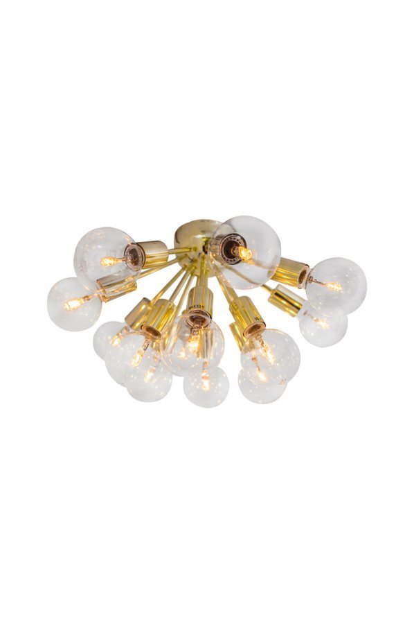 Sunshine-plafondi, jossa messinginväristä metallia. Korkeus 23 cm, ø 38 cm. 14 x iso lampunkanta E27. Enintään 30 W. Koukkuripustus. Lampuiksi suunnitellaan 30 W:n ekopallolamppuja, lamput eivät ole mukana. Design Anders Eriksson.