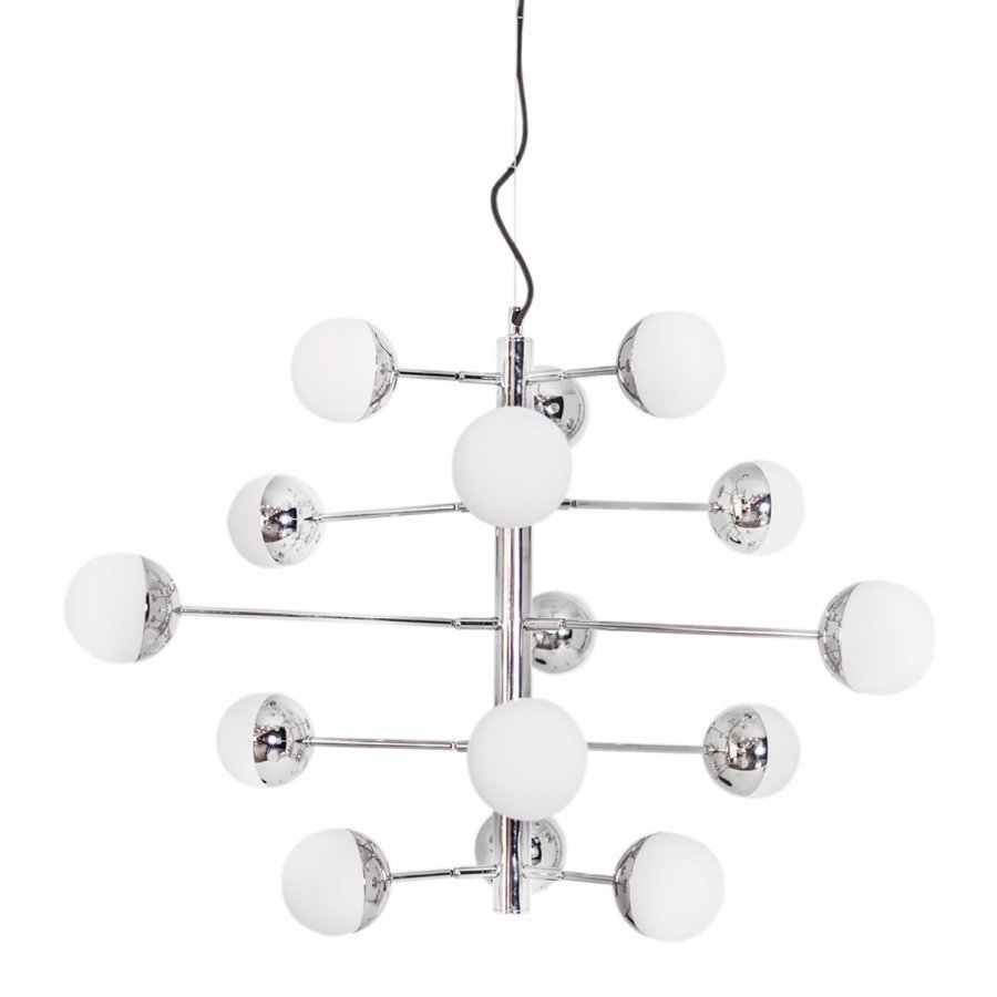 Supreme kattovalaisin herättää tunteita! Kaunis ja jännittävä valaisin koostuu valkoisesta lasista, jotka on sijoitettu metallirunkoihin. Nämä muodostavat pienen pallon, jossa on useita valopilkkuja. Supremen korkeus on 60cm, halkaisija 42cm. Metallinen kattokupu ja musta tekstiilijohto sisältyvät. Valonlähteet eivät sisälly.