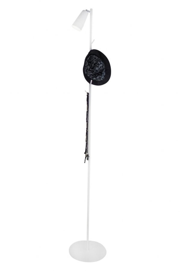 Valet-lattiavalaisin metallia, korkeus 2 m, pohjalevyn Ø 30 cm. Spottivalo, E14-lampunpidike. Enintään 25 W. 6 koukkua kevyille esineille, läpikuultava johto. Valonlähde ei mukana.