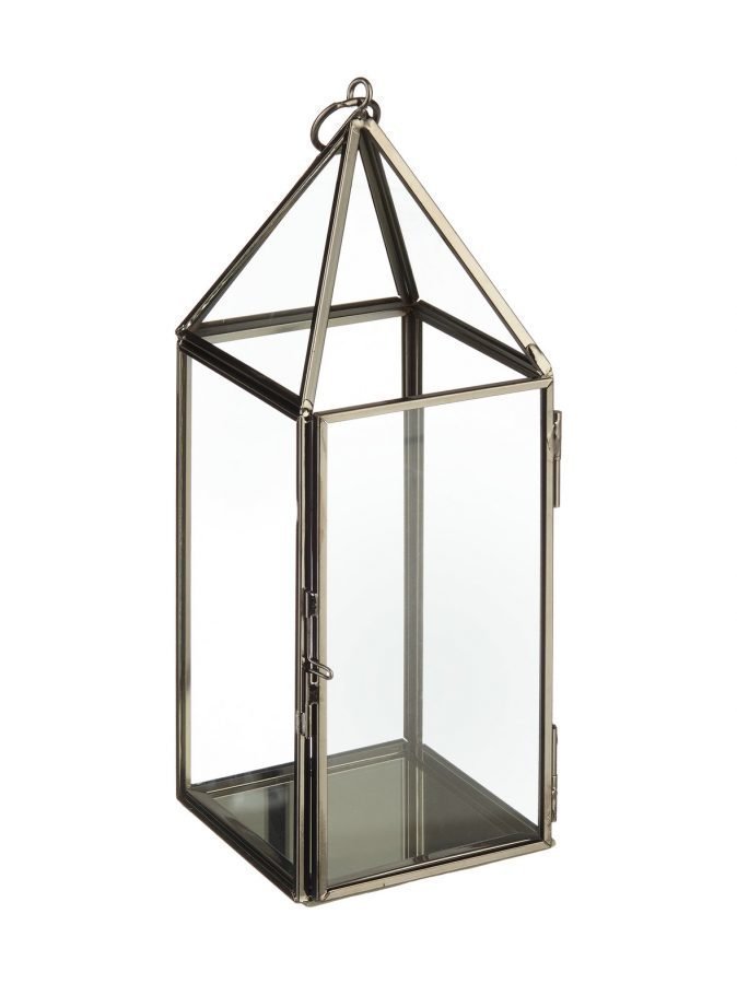 Tyylikäs lyhty on materiaaliltaan lasia ja metallia.