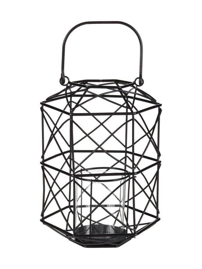Modernissa lyhdyssä on ripustuskahva ja lasinen kynttiläpidike. Materiaali on metallia. Korkeus on 23 cm ja halkaisija 17 cm.