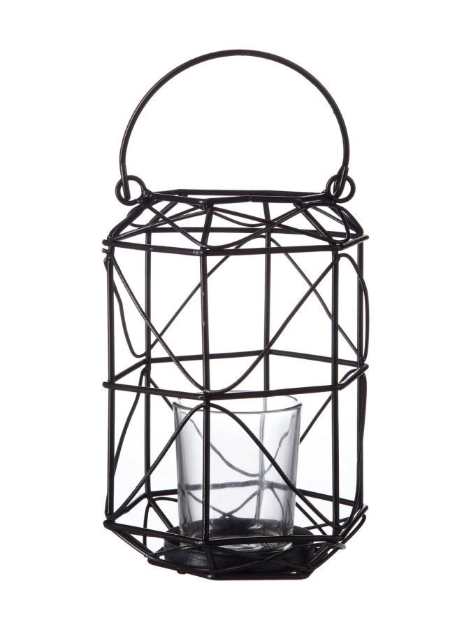 Moderni kuusikulmainen lyhty on valmistettu metallilangasta. Lyhtyyn kuuluu tuikkulasi.