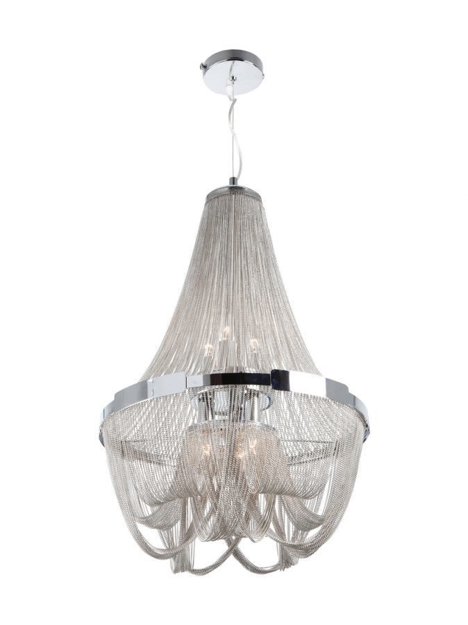Näyttävä ja moderni valaisin koostuu kerroksittain asetetuista metalliketjuista ja metallikehyksestä. Valaisimen materiaali on metallia ja valonlähde on 6 x E14, max. 40 W. Polttimot eivät sisälly pakkaukseen. Valaisimen halkaisija on 46 cm ja johdon pituus 3 metriä. Valaisimessa on sokeripalakytkentä.