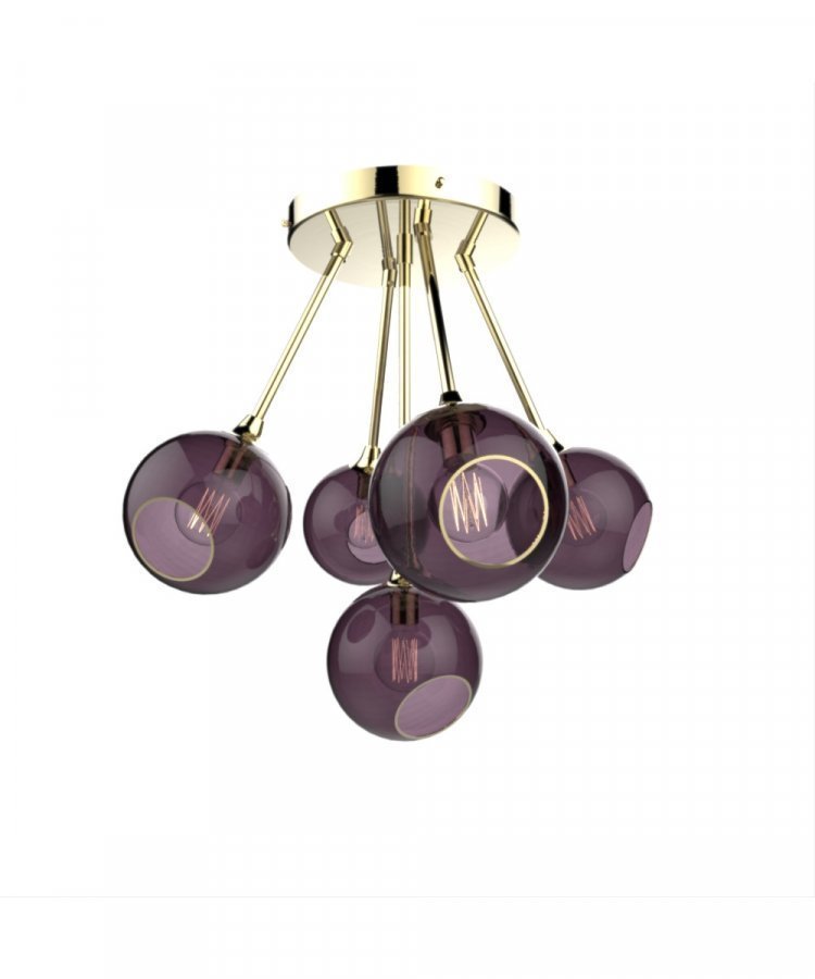 Design: Design By Us. Konsepti: Design By Usin Ballroom Molecule on ainutlaatuinen ja koristeellinen kattovalaisin. Se on valmistettu puhalletusta lasista ja koristeltu käsin maalatulla messinkireunuksella. Ballroomin elegantti ja erottuva ulkoasu tekee siitä täydellisen sinulle, joka etsit uutta valaistusta tuomaan kotiisi hieman jännitystä. Ballroom Molecule sopii erinomaisesti käytäville, olohuoneeseen tai mihin tahansa muualle kodissasi. Tämä valaisin on saatavilla viidessä eri värissä – violetti, keltainen, ruusu, savu ja armeijan vihreä. Se on saatavilla joko mustalla tai messinkisellä varrella. Huomioi, että puhallettu lasi voi sisältää pieniä kuplia. Yksikään sävy ei ole identtinen.