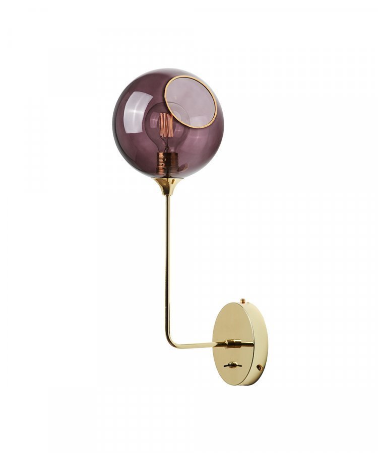 Design: Design By Us. Konsepti: Design By Usin Ballroom The Wall on ihana ja dynaaminen seinävalaisin sekä uusin Ballroom-perheen jäsen. Ballroomin yksinkertainen tyylikkyys tekee siitä täydellisen valaisimen sinulle, joka tarvitset seinävalaisinta luomaan viihtyisän tunnelman pitkille käytäville tai kodin pimeisiin tiloihin. Tämä seinävalaisin on saatavilla violetilla tai savuisena lasina kultaisella reunuksella ja mustalla tai messinkisellä pohjalla varustettuna. Voit valita pohjaksi joko 37cm tai 57 cm. Tässä valaisimessa 57cm. Huomioi, että puhallettu lasi voi sisältää pieniä kuplia eikä yksikään sävy ole identtinen.