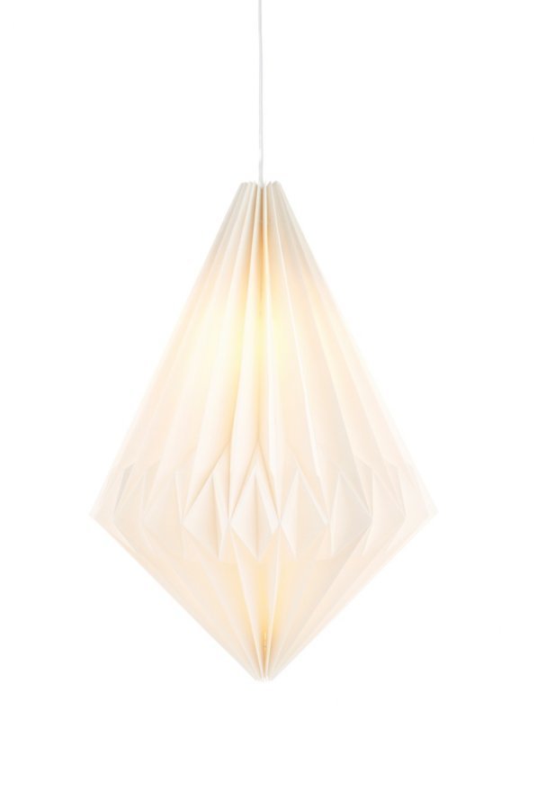 Timantin muotoinen valaisin vaaleaa, ilmavaa paperia. Materiaali: Paperia. Koko: 52×36 cm. Kuvaus: Paperivalaisin, jossa lampunpidike ja johto. Kanta/lamppu: 1 x E14, enintään 25 W:n hehkulamppu. Vinkki: Paperivalaisimia on saatavana erimuotoisina – jokainen ilmaisee erilaista tyyliä. Valitse muoto, joka toistuu kuvioina muussa sisustuksessa.