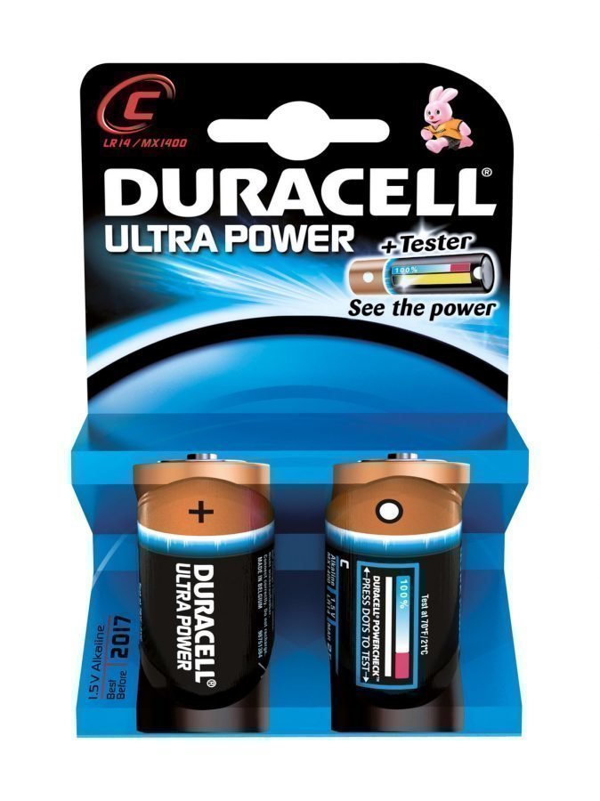 Pakkaus sisältää kaksi 1.5 V C-alkaliparistoa. Ultra Power -paristoissa on Powercheck-toiminto, joka näyttää, kuinka paljon tehoa paristossa on jäljellä, jotta paristosta saa irti kaiken mahdollisen suoritustehon.