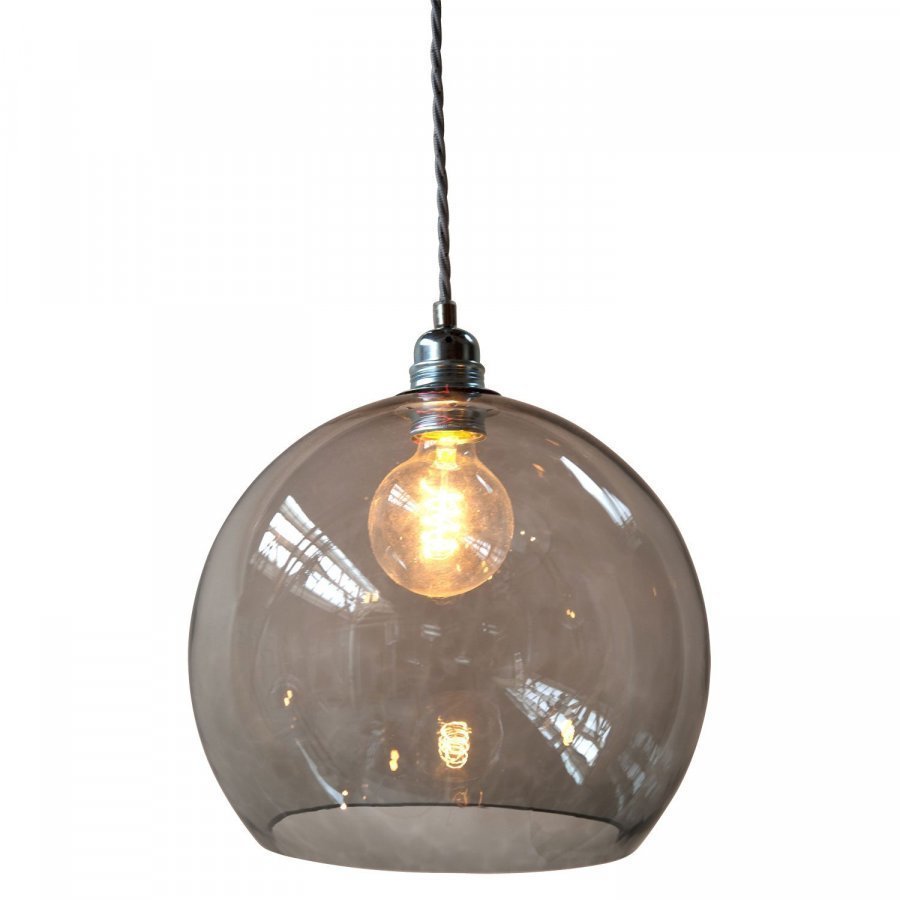 Rowan riippuvalaisin L, Ebb & Flow. Kaunis suupuhalletusta lasista valmistettu riippuvalaisin. Metallisen pinnan ja punotun harmaan narun yhdistelmä tekee tästä lampusta lyömättömän sisustusyksityiskohdan kotiisi. Hieno ominaisasia tässä lampussa on se, että se toimii erinomaisesti yksinään, mutta saa erityisen hienon lisän kun yhdistetään useampi samanlainen valaisin yhdessä esille. Superluksusta, jos meiltä kysytään!