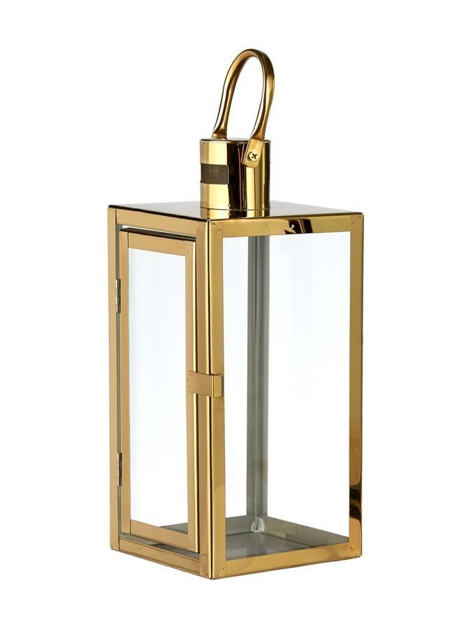 Kullansävyinen metallilyhty tuo tunnelmaa kodin sisustukseen.