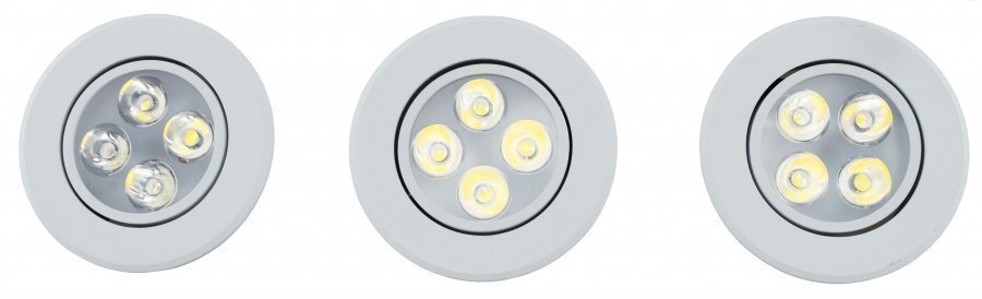 Kolme upotettavaa 4W LED spottivalaisinta. Lisäksi pakkaus sisältää muuntajan ja 1 m pidennysjohdot sekä lenkitysyhteen jos valaisimia asennetaan vähemmän kuin 3 kpl.Upotussyvyys 60 mm (tuote 40 mm ja valaisimen päälle pitää jättää 20 mm vapaata tilaa). Jännite 230-240V~50Hz. Valoteho 925 lm. Valonvärisävy 3000-3300 K (lämmin valkoinen). Valokulma 60°. Kohdistussäätö 0-30°. Käyttöikä n. 40000 tuntia. Reikien halkaisija 70 mm. Suojausluokka IP20. LED valmistaja Epistar Taiwan. Soveltuu käytettäväksi TRIAC himmentimien kanssa.