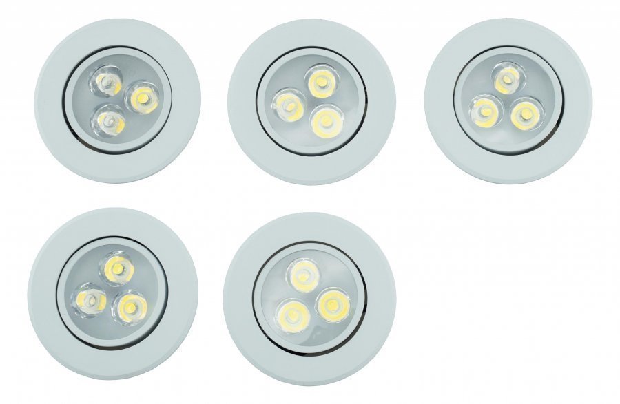 Viisi upotettavaa 3W LED spottivalaisinta. Lisäksi pakkaus sisältää muuntajan ja 1 m pidennysjohdot sekä lenkitysyhteen jos valaisimia asennetaan vähemmän kuin 5 kpl.Upotussyvyys 60 mm (tuote 40 mm ja valaisimen päälle pitää jättää 20 mm vapaata tilaa). Jännite 230-240V~50Hz. Valoteho 1145 lm. Valonvärisävy 3000-3300 K (lämmin valkoinen). Valokulma 60°. Kohdistussäätö 0-30°. Käyttöikä n. 40000 tuntia. Reikien halkaisija 70 mm. Suojausluokka IP20. LED valmistaja Epistar Taiwan. Soveltuu käytettäväksi TRIAC himmentimien kanssa.