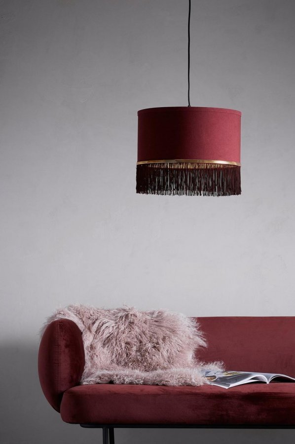 Kattovalaisin, jossa kangaspäällysteinen varjostin muovia. Metallinhohtoinen nauha ympärillä ja hapsut alareunassa. Korkeus 20 cm, Ø 38 cm. Hapsujen pituus 10 cm. Johdon pituus 120 cm. Kattokuppi muovia. E27. Valonlähde ei mukana.
