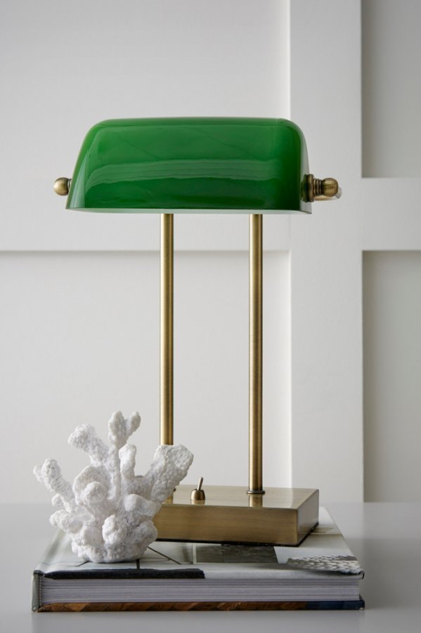 Pöytävalaisin metallia, jossa harjattu antiikkimessinginvärinen viimeistely. Suunnattava varjostin paksua vihreää lasia. Jalka 17×11 cm, korkeus 2,5 cm. Virtakytkin pöytälevyssä. Kokonaiskorkeus 33 cm, leveys 21 cm. Musta johto, jonka pituus 150 cm. Pieni lampunkanta E14. Enintään 40 W. Lamppu ei mukana.