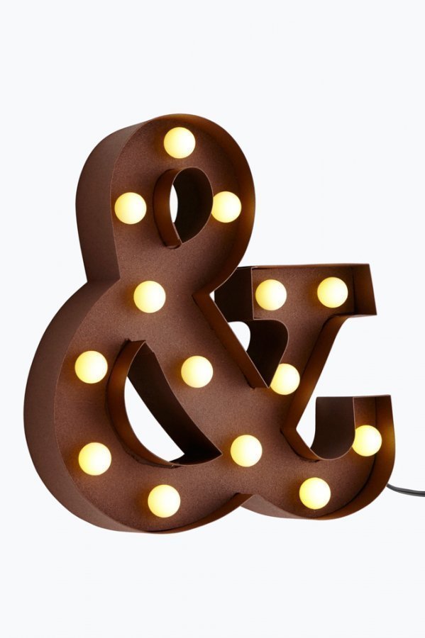 Pöytävalaisin, jonka voi myös ripustaa seinälle. Ruosteenväristä metallia, &-merkin muoto. 14 pyöreää LED-lamppua (2700 k.). Valaisimen mitat: korkeus 24 cm, leveys 21 cm, syvyys 5 cm. Kierretty johto, jossa virtakytkin, johdon pituus 2 m.