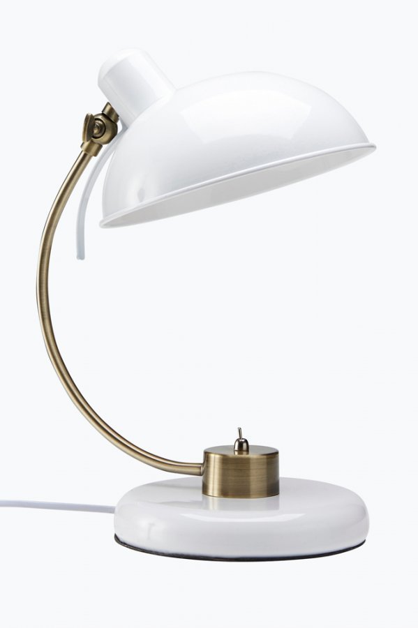 Pöytävalaisin metallia. Korkeus 34 cm. Jalan ø 18 cm. Varjostimen ø 21 cm. Johdon pituus 150 cm. Virtakytkin valaisimen jalassa. Seinäpistoke. Pieni lampunkanta E14.