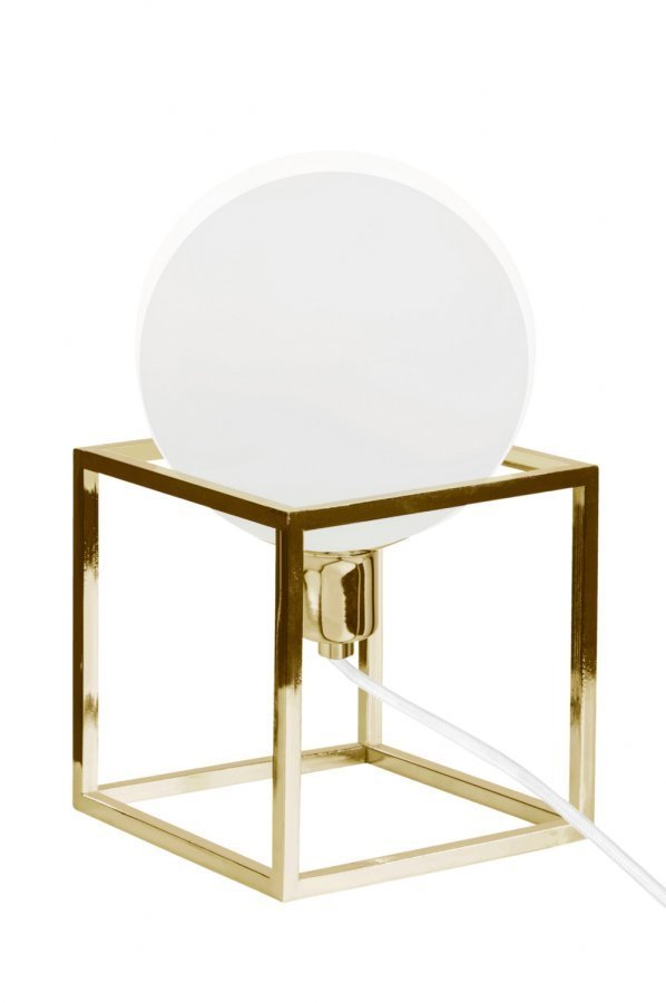 Cube-pöytävalaisin, jossa nelikulmainen metallirunko. Kupu opaalilasia. Valkoinen kangaspäällysteinen johto. Korkeus 24 cm, leveys 13 cm, syvyys 13 cm. Lampunpidike E14. Enintään 40 W. Lamppu ei ole mukana. Design: Patrick Hall.
