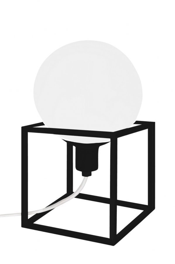 Cube-pöytävalaisin, jossa nelikulmainen metallirunko. Kupu opaalilasia. Valkoinen kangaspäällysteinen johto. Korkeus 24 cm, leveys 13 cm, syvyys 13 cm. Lampunpidike E14. Enintään 40 W. Lamppu ei ole mukana. Design: Patrick Hall.