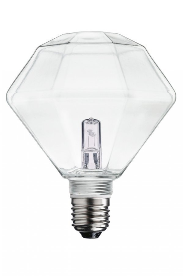 Hehkulamppu, jossa kanta, halogeenilamppu ja irrotettava timantinmuotoinen lasikupu. Himmennettävä. Teho 18 W (=25 W). Lampunkanta: iso E27-kanta Paloaika: jopa 2000 tuntia Värilämpötila: 2800 K Valovirta: 204 lm