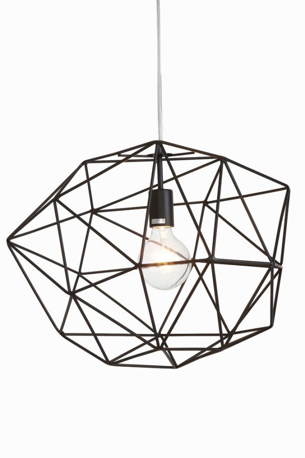 Vahvat tangot kuparipäällysteistä metallia. Vaijeri ja läpikuultava johto. Metallinen kattorasia. Johdon pituus 120 cm. Korkeus 42 cm. ø 48 cm. E27. Enintään 60 W. Enintään 100 mm:n kokoinen hehkulamppu.