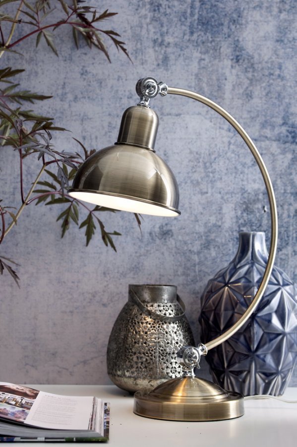 Pöytävalaisin metallia. Säädettävä varjostin. Ø 18 cm. Valaisin E27. Enintään 40 W. Varjostimen ympärysmitta 18 cm. Valaisimen varren korkeus 54 cm. Jalan halkaisija 18 cm.