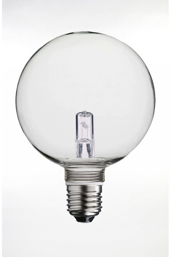 Hehkulamppu, jossa kanta, halogeenilamppu ja irrotettava lasikupu. Himmennettävä. Teho 18 W (=25 W). • Lampunkanta: iso E27-kanta • Paloaika: jopa 2000 tuntia • Värilämpötila: 2800 K • Valovirta: 204 lm Energialuokka C