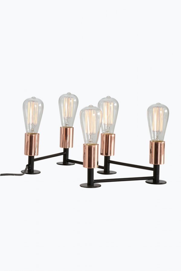 Pöytävalaisin, joka koostuu 5 valaisimesta, joita liikkuvat metallitangot yhdistävät. Voit siis muotoilla valaisimen haluamallasi tavalla. Pituus 3383 cm. Korkeus ilman valaisimia 12,5 cm. Iso lampunkanta, 5XE27. Enintään 60 w. Seinäpistoke. Valaisimet eivät ole mukana. Kokeile erilaisia lamppuja ja luo mieleisesi vaikutelma!