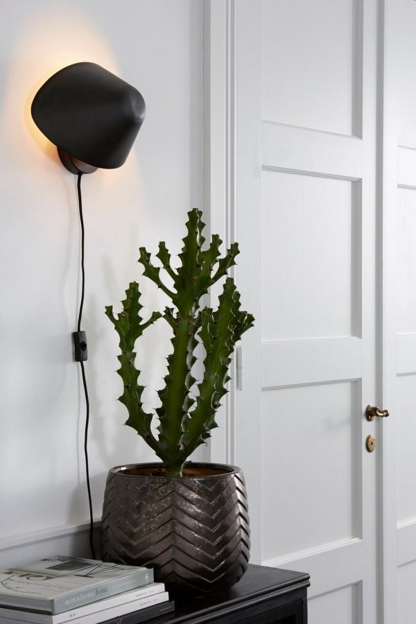 Seinävalaisin mattamustaa metallia. Valaisin antaa koristeellisen tunnelmavalon. Kullanvärinen sisäpinta. Korkeus 22 cm, leveys 30 cm, syvyys n. 15 cm. Kangaspäällysteinen johto, jossa virtakytkin. Johdon pituus 2 m. Iso lampunkanta E27. Enintään 40 W. Valonlähde ei mukana.