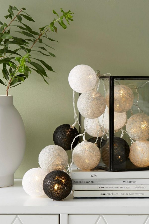 Valoköynnös, jossa 16 valkoista narupalloa. LED-lamput. Läpikuultava johto. Muuntaja 6×6 cm. Kokonaispituus 6 m. Johdon pituus 3 m. Lamppujen välinen etäisyys 20 cm. Seinäpistoke.