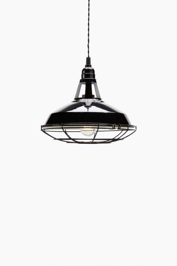 Kattovalaisin kiiltävää metallia. Ritilä alapuolella. Valkoinen sisäpinta. Korkeus 28 cm. ø 32 cm. Kattopistoke ja kierretty kangaspäällysteinen johto. Iso lampunkanta.