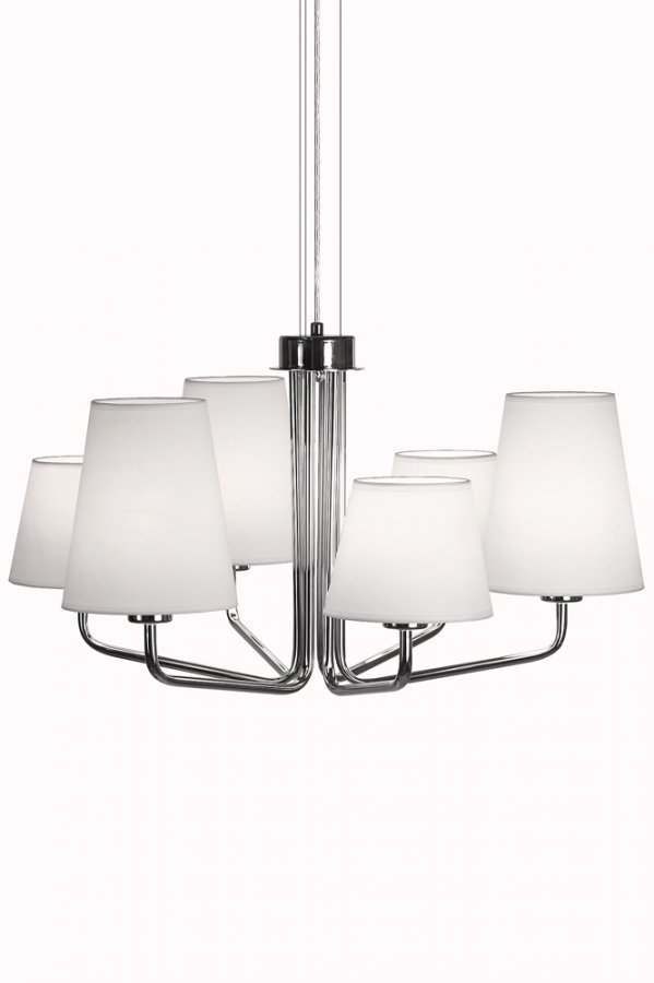 Metallinen kattokruunu, jossa kahdenkokoisia valkoisia puuvillavarjostimia. Läpikuultava johto ja vaijerit. Halkaisija 65 cm, korkeus 40 cm. Lampunkanta 6 x E27. Enintään 60W.