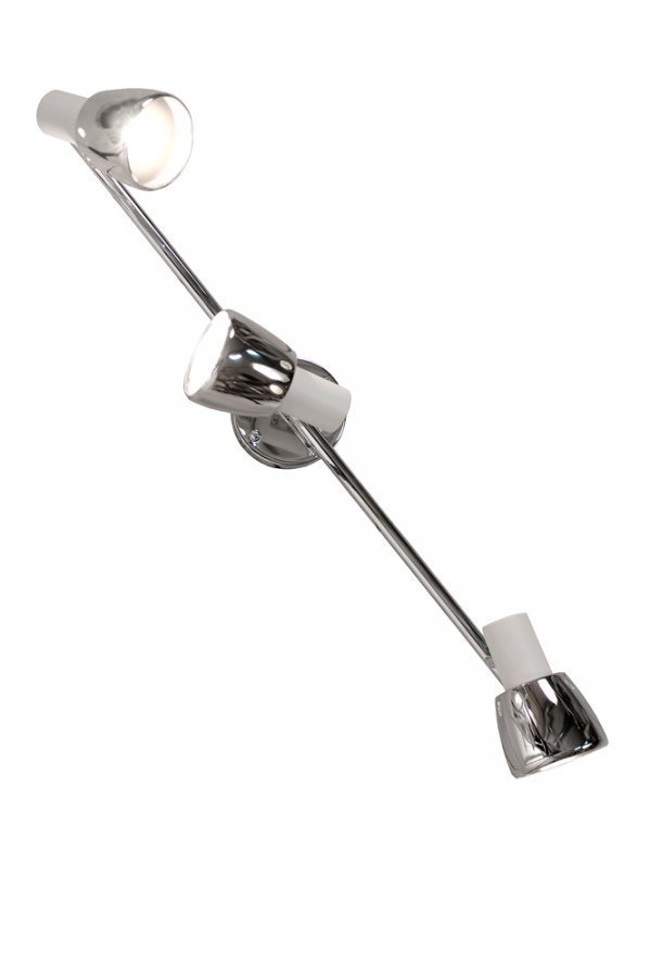 Kattospottivalaisin metallia. Kattolevy ja kuvut krominväriset. Lamppupesät värilliset. Koristereikärivi kuvuissa. Korkeus 12 cm. Leveys 12 cm. Pituus 60 cm. Lampunkannat 3 x E14. Enintään 40W.