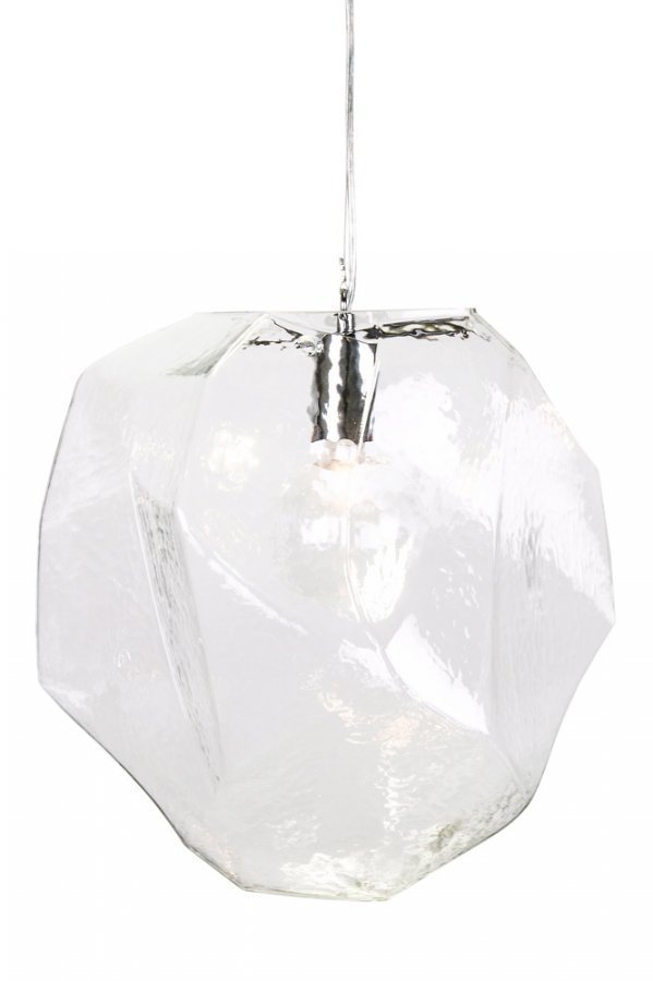 Rock-kattovalaisin hiottua, kulmikasta lasia. Krominväriset detaljit. Läikuultava johto sekä vaijeri. Halkaisija 40 cm. Korkeus 42 cm. Lampunkanta E27. Enintään 60 W. Design: Tess Palm.