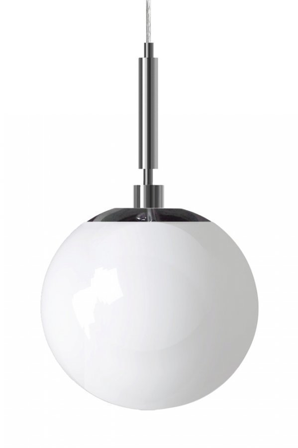 Kattovalaisin krominväristä metallia. Opaalikupu valkoista duplex-lasia. Valkoinen kangaspäällysteinen johto ja krominvärinen kattokuppi. Korkeus 55 cm. Halkaisija 35 cm. Lampunkanta E27. Enintään 60 W. Design: Patrick Hall.