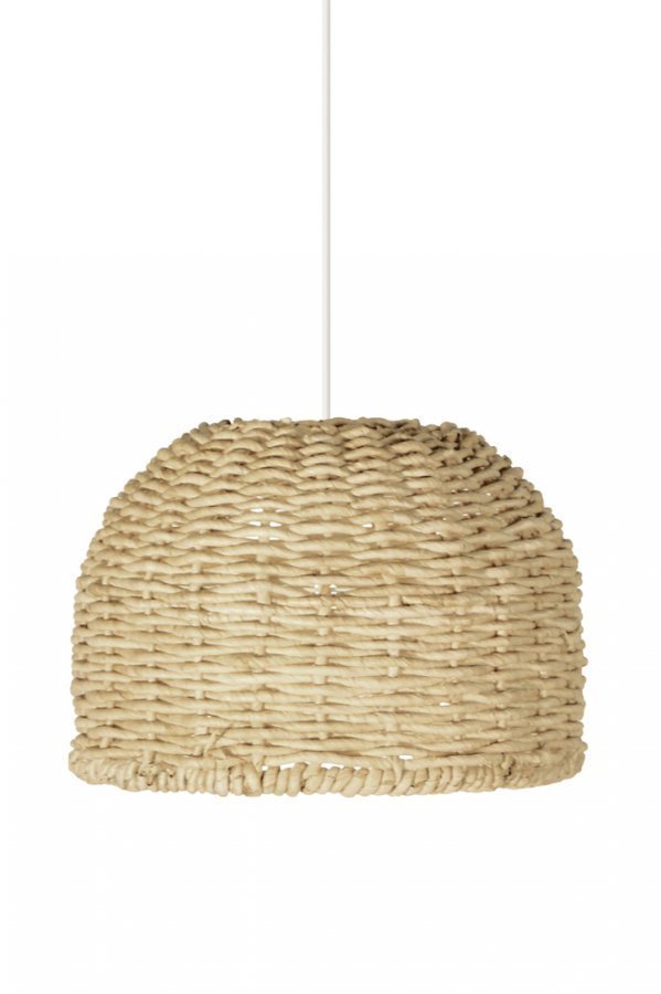 Kattovalaisin, jonka varjostin luonnonväristä, punottua hamppua. Varjostin siivilöi valon kauniisti. Korkeus 22 cm. Halkaisija 32 cm. Valkoinen johto ja ripustusputki. Lampunkanta E27. Enintään 60 W.
