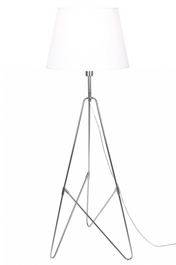 Sway-lattiavalaisin krominväristä metallia. Pehmeästi pyöristetyt jalat ja valkoinen puuvillavarjostin. Läpikuultava johto, jossa katkaisin. Korkeus 135 cm. Halkaisija 35 cm. Lampunkanta E27. Enintään 60 W. Design: Tess Palm.
