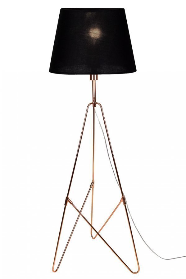 Sway-lattiavalaisin kuparinväristä metallia. Pehmeästi pyöristetyt jalat ja musta puuvillavarjostin. Läpikuultava johto, jossa katkaisin. Korkeus 135 cm. Halkaisija 35 cm. Lampunkanta E27. Enintään 60 W. Design: Tess Palm.