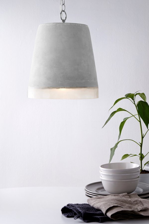 Kattovalaisin trendikästä sementtiä ja läpikuultavaa akryylimuovia. Tunnelmallinen alaspäin suuntautuva valo. ø 29 cm. Korkeus 29 cm. läpikuultava, kierretty johto 4 m, metalliketju 1,2 m. Kattopistoke. Iso kanta. Paino 4,9 kg. Valonlähde ei ole mukana. Valaisimen tyyli muuttuu valitun lampun mukaan. Kokeile ja löydä sinulle mieluinen tyyli!
