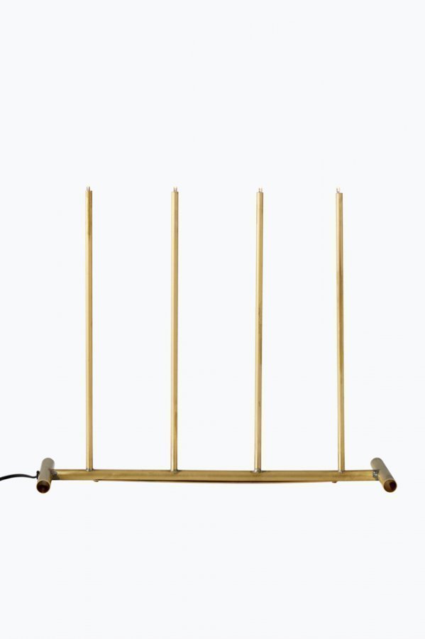 Kynttelikkö, jonka putkissa raakaviimeistely. 4 LED-lamppua. Musta johto, jossa virtakytkin ja muuntaja, johdon pituus 240 cm. LxK 50,5 x42,5 cm.