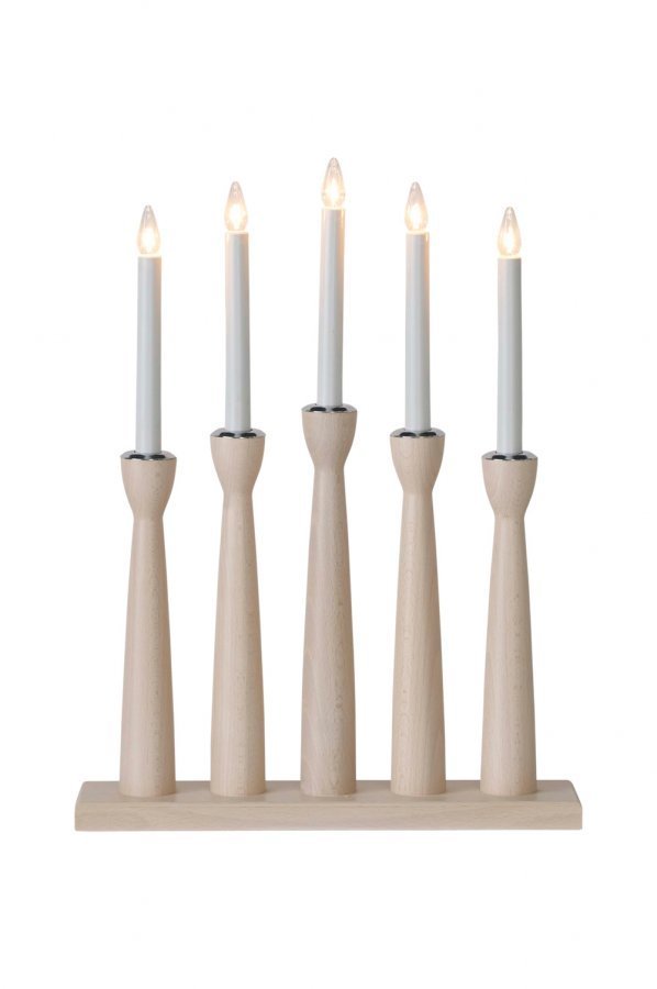 Måseskär-sähkökynttelikkö puuta, irrotettavat yksityiskohdat kromia. Lampunpidikkeet 5xE10 enintään 3W. 2 m: valkoinen johto, jossa virtakytkin ja seinäpistoke. Korkeus 49 cm, leveys 36 cm, pituus 8 cm.