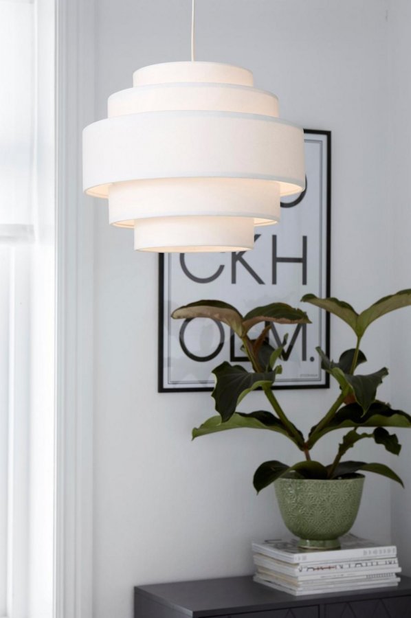 Kattovalaisin, jonka kangasvarjostimessa monta erikokoista kerrosta. ø n. 35 cm. Korkeus 28 cm. Muovinen kattokuppi, jossa ripustuskoukku ja suoraliitäntä (ei kruunupistoketta). Johdon pituus 120 cm. Iso lampunkanta E27. Enintään 60 W. Lamppu ei ole mukana.