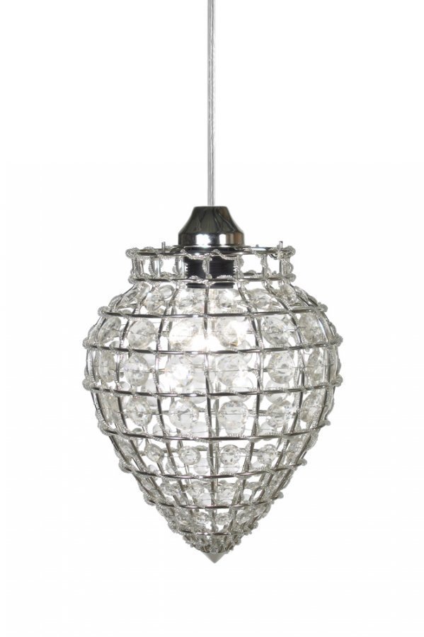 Mona-kattovalaisin krominväristä metallia. Kirkkaat akryyliprismat. Läpikuultava johto. Halkaisija 20 cm, korkeus 30 cm. Lampunkanta E27. Enintään 60 W. Design: Patrick Hall.