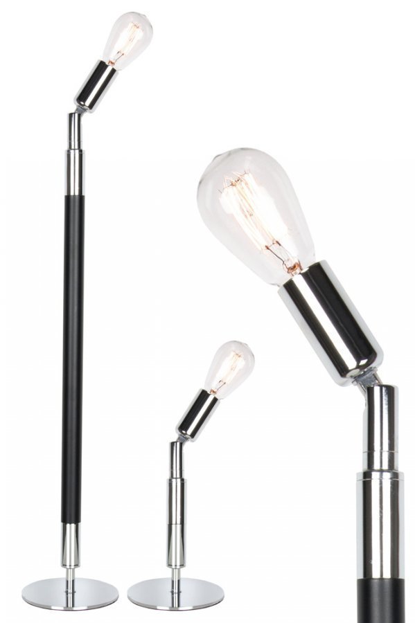 Mr Hyde -pöytävalaisin mattamustaksi maalattua metallia ja kromia. Nivelletty varsi, jota voi lyhentää ja jonka avulla lamppua voi kallistaa. 2 m:n läpikuultava johto, jossa katkaisin. Korkeus 62/26,5 cm. Halkaisija 12 cm. Lampunkanta E14. Enintään 40 W. Design: Patrick Hall.
