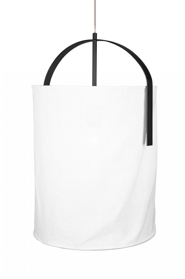 Nest-kattovalaisin valkoista läpikuultavaa pellavaa. Koristekaari metallia. Läpikuultava johto. Korkeus 60 cm. Halkaisija 35 cm. Lampunkanta E27. Enintään 60 W. Design: Patrick Hall.