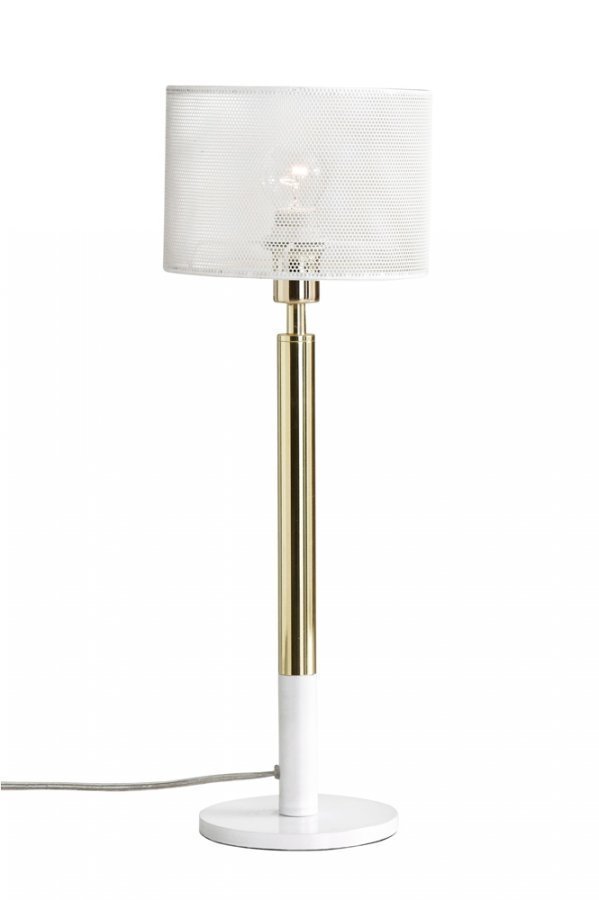 Pöytävalaisin, jossa jalka ja varjostin metallia. Reiitetty varjostin, valaisee kauniisti. ø 17 cm. Korkeus 49 cm. Seinäpistoke. Pieni lampunkanta E14. Enintään 40 w.