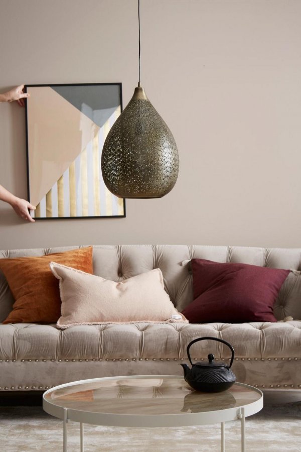 Kattovalaisin metallia, jossa lävistetty reikäkuvio. Antaa kauniin, tunnelmallisen valon. Kattokuppi sointuvan sävyistä metallia. Korkeus 44 cm, alareunan ø 31 cm. Musta johto, johdon pituus 145 cm. Iso lampunkanta E27. Enintään 60 W. Valonlähde ei mukana.