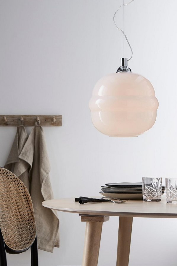 Kattovalaisin lasia, metallinen detalji ylhäällä. Ø 29 cm, korkeus 32 cm. Läpikuultava johto 1,2 m. Kattokuppi metallia. Ripustusvaijerissa säädettävä korkeus. E27. Enintään 40 W. Valonlähde ei mukana.