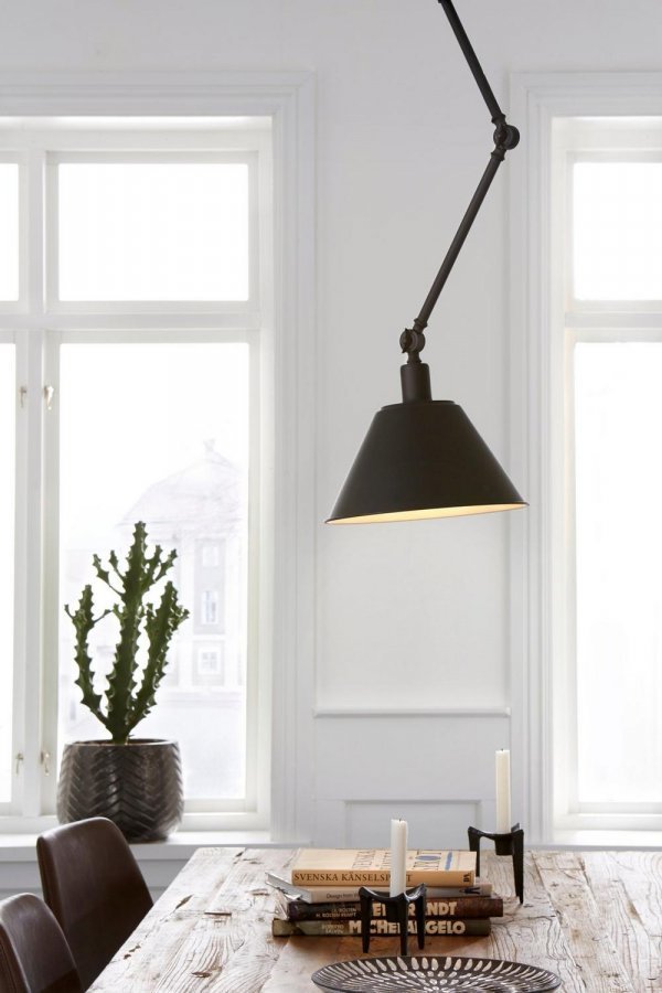 Kattovalaisin mattamustaa metallia. Suunnattava varsi ja säädettävä varjostin. Kokonaiskorkeus n. 90 cm. Ø n. 30 cm. Kattokuppi metallia. Iso lampunkanta E27. Enintään 40 W.