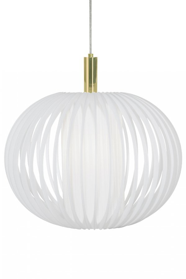 Plastband XL -kattovalaisin. Metallirungon ympärille kierrettyä valkoista muovinauhaa. Ripustusputki messinginväristä metallia. Halkaisija 50 cm. Korkeus 38 cm. Lampunkanta E27. Enintään 60 W. Design: Anna Andersson.