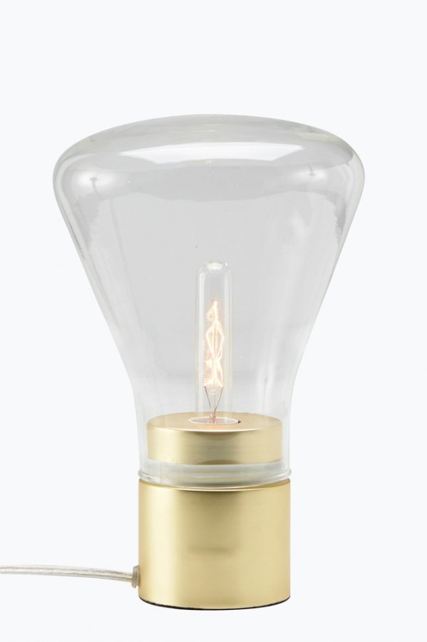 Pöytävalaisin harjattua messinkiä ja kirkasta lasia. Johdon pituus 2 m. Seinäpistoke. ø 17 cm. Korkeus 24 cm. Pieni lampunkanta. Lamppu ei mukana. Eri kokoisilla ja -tyyppisillä lampuilla on suuri vaikutus valaisimen ulkonäköön. Kokeile!