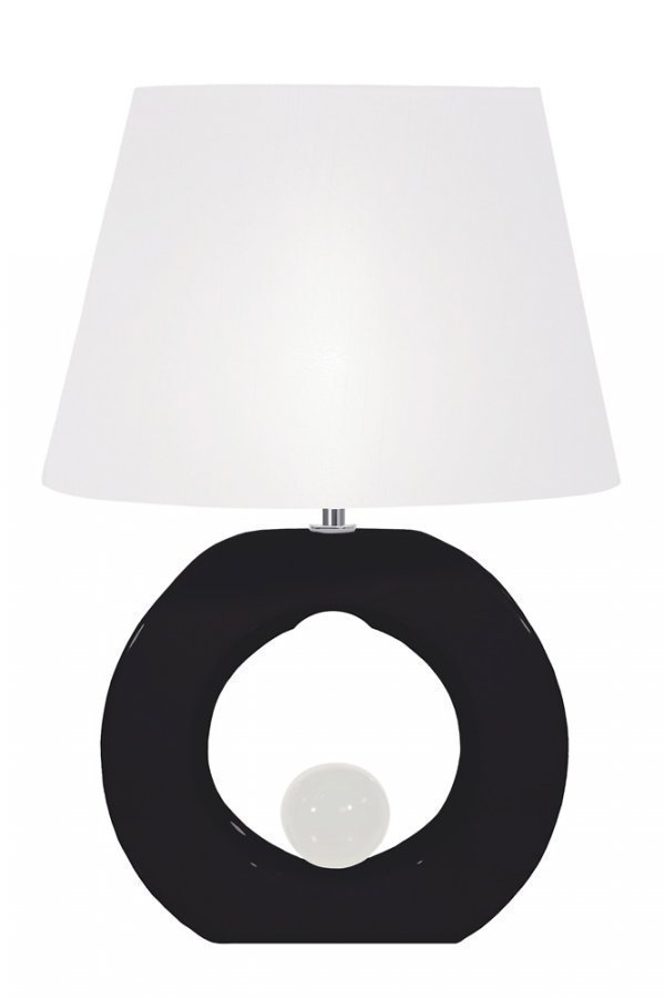 Pöytävalaisin keramiikkaa. Koristekuula keramiikkaa. Varjostin puuvillaa. Läpikuultava johto, jossa katkaisin. Korkeus 48 cm. Varjostin 34 x 22 cm. Lampunpidike E27. Enintään 60 W.